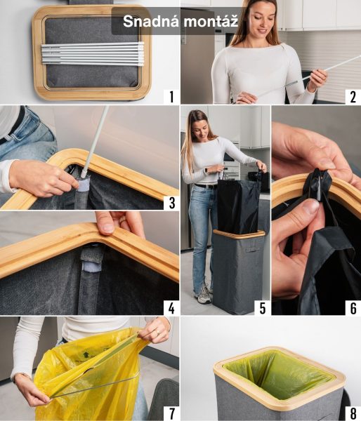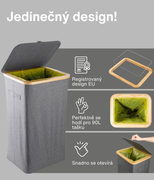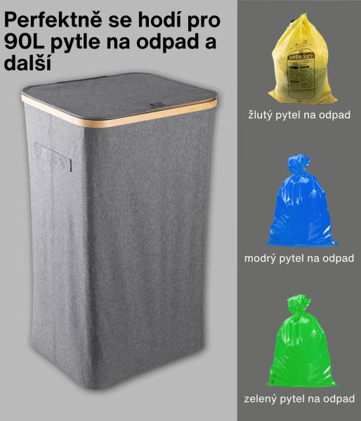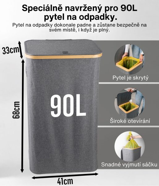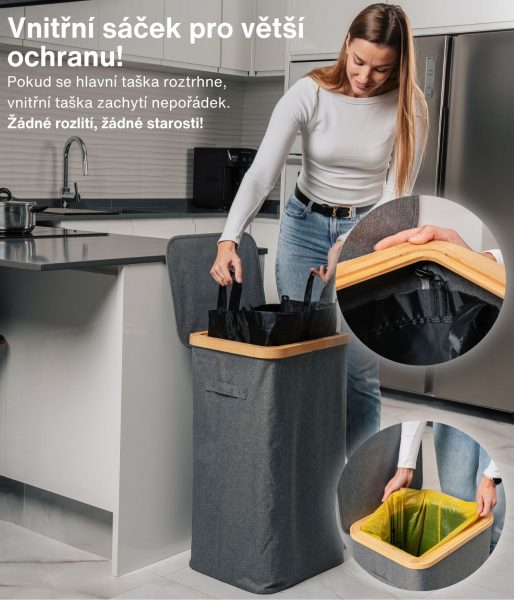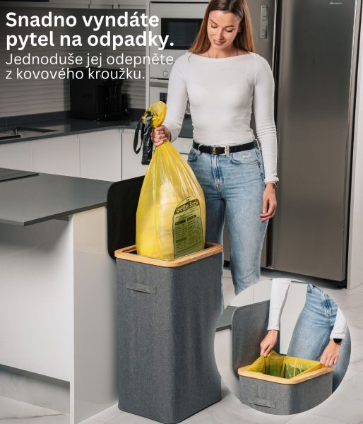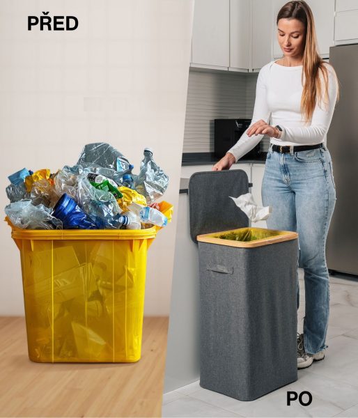 Tento model se může pochlubit zesílenými švy, odolnými materiály a esteticky propracovanou šedou barvou, která dokonale zapadne do každého prostoru – ať už jde o moderní kancelář nebo minimalistickou kuchyni. Jeho kompaktní a přitom prostorný design umožňuje efektivní recyklaci, aniž by zabíral příliš mnoho místa. Koš má navíc bambusový rám se železným kroužkem, ke kterému je připevněn sáček na odpadky, což usnadňuje jeho výměnu a používání. Koš je určen pro 90l odpadkové pytle, ale snadno můžete použít i větší.