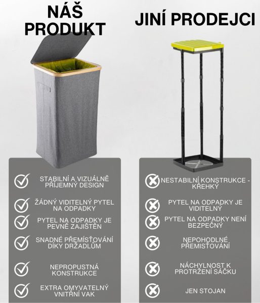 - INOVATIVNÍ KONSTRUKCE: Náš patentovaný bambusový rám s kovovým kroužkem bezpečně drží pytel na odpadky na místě a zabraňuje jeho prohýbání. Látkové víko diskrétně ukrývá odpad a pomáhá udržet zápach.
