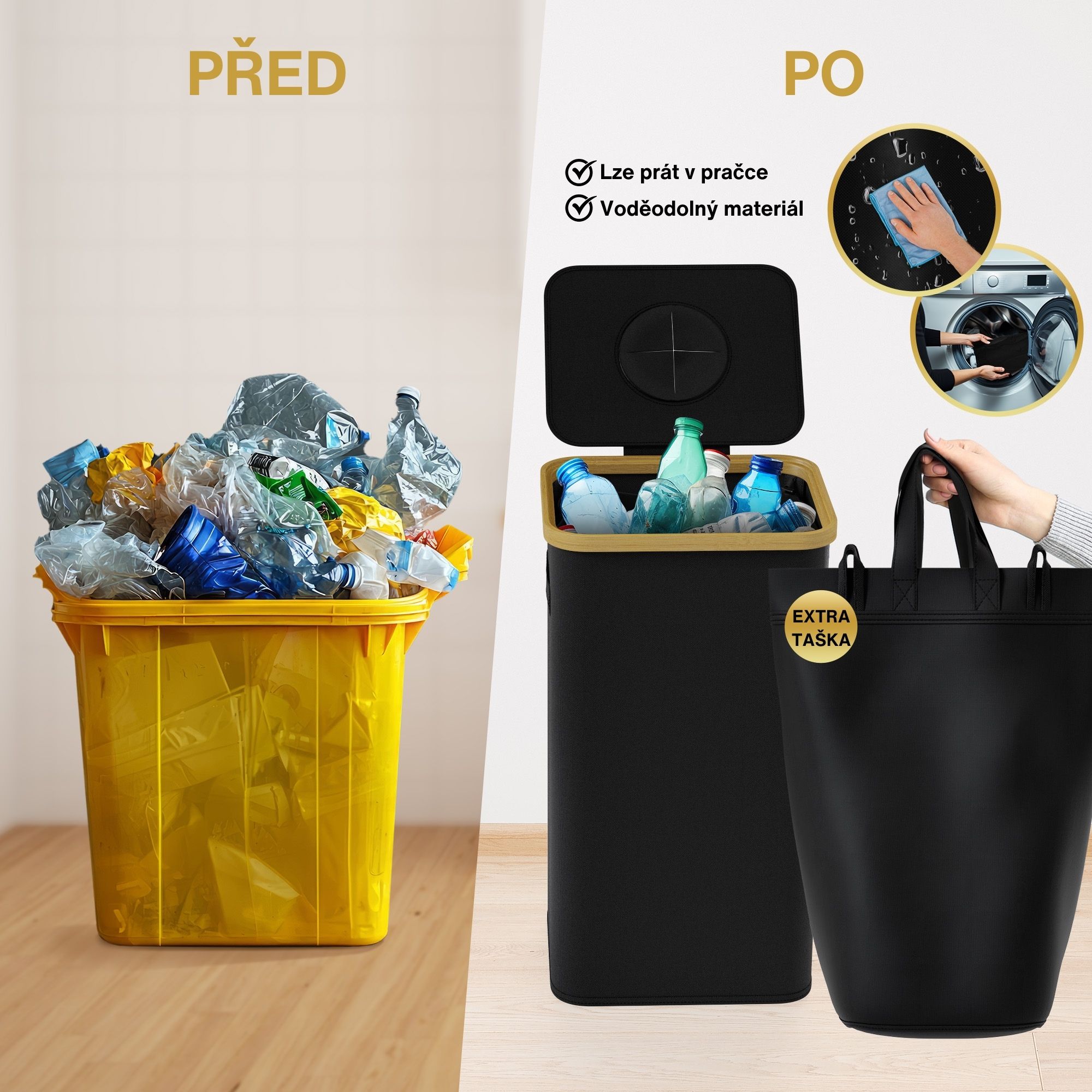 - KAPACITA 100L: Nabízí dostatek místa pro velké množství recyklovatelného materiálu, od skla až po plast. Vnitřní taška umožňuje snadné zvedání, čištění a organizaci.