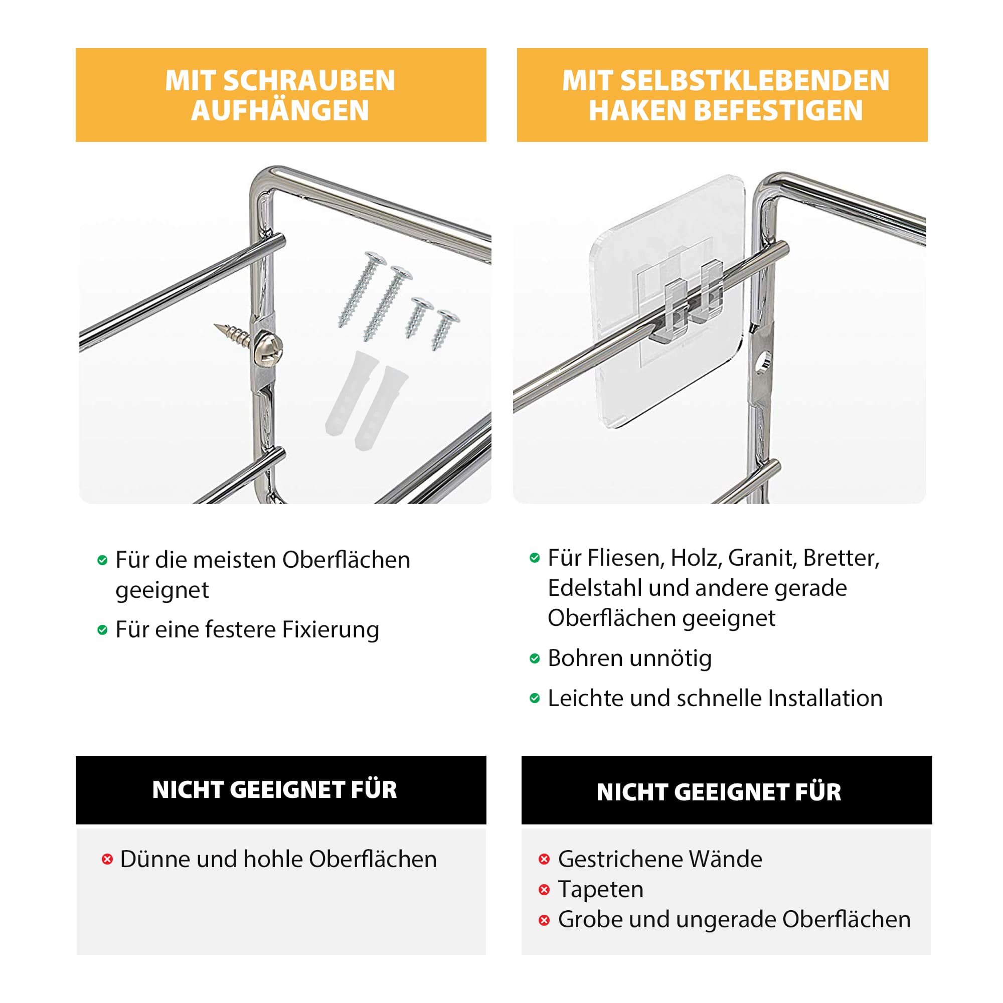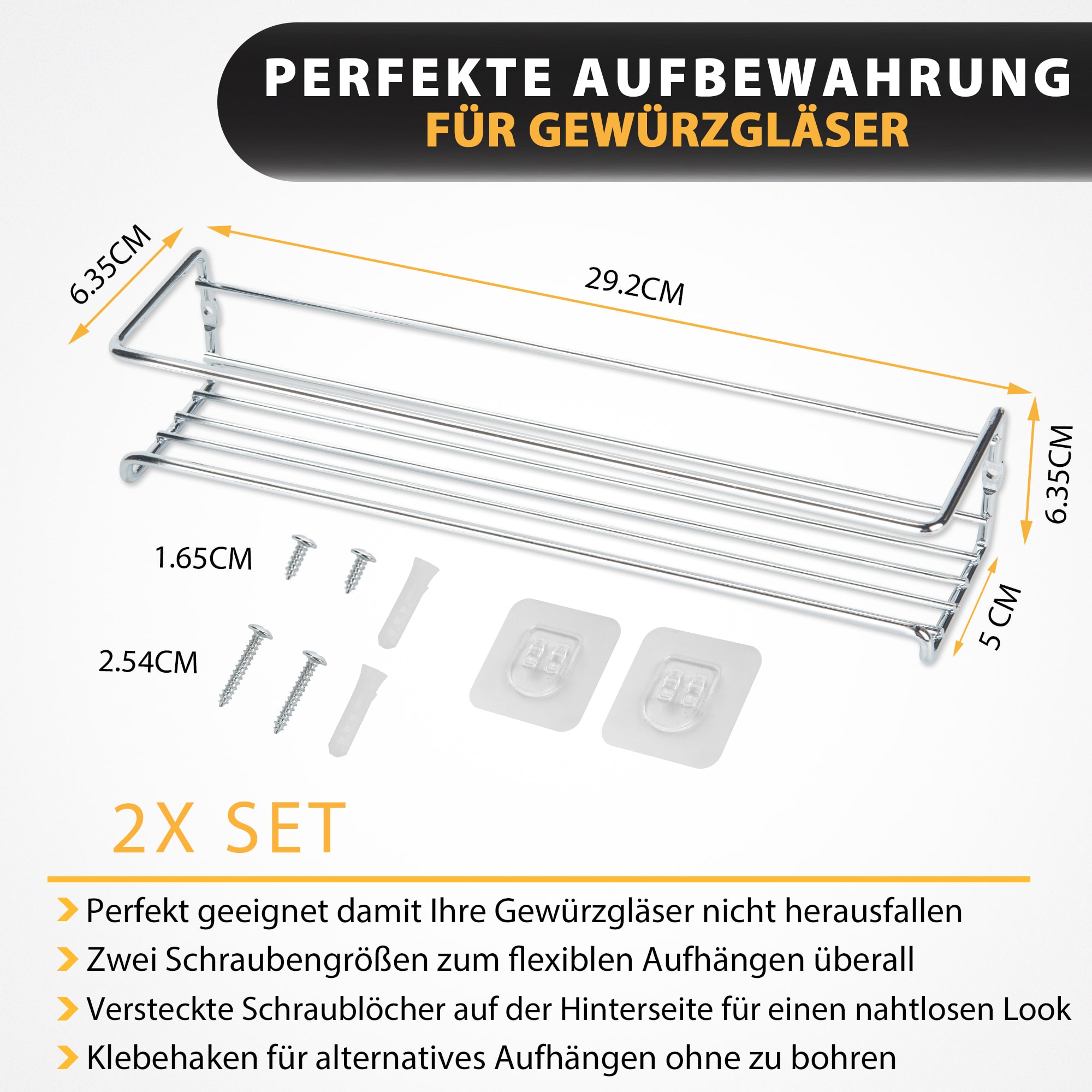 ✅ SNADNÁ MONTÁŽ – K instalaci těchto kovových stojanů na koření můžete použít buď dodané hmoždinky a šrouby, nebo jednoduše připevnit police pomocí přiložených lepicích podložek. Volba je na vás!