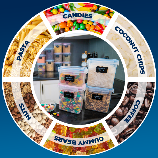 Naše sada je ideální na drobnosti, jako jsou bonbony, müsli, oříšky a sušenky, základní potraviny, jako je mouka, a snídaňové potraviny, jako je zrnková káva. Skladujte potraviny v těchto průhledných nádobách – skladování a uspořádání bude snadné a budete k nim mít přístup, kdykoli budete potřebovat. Od této chvíle si už nemusíte pamatovat, kde co je!