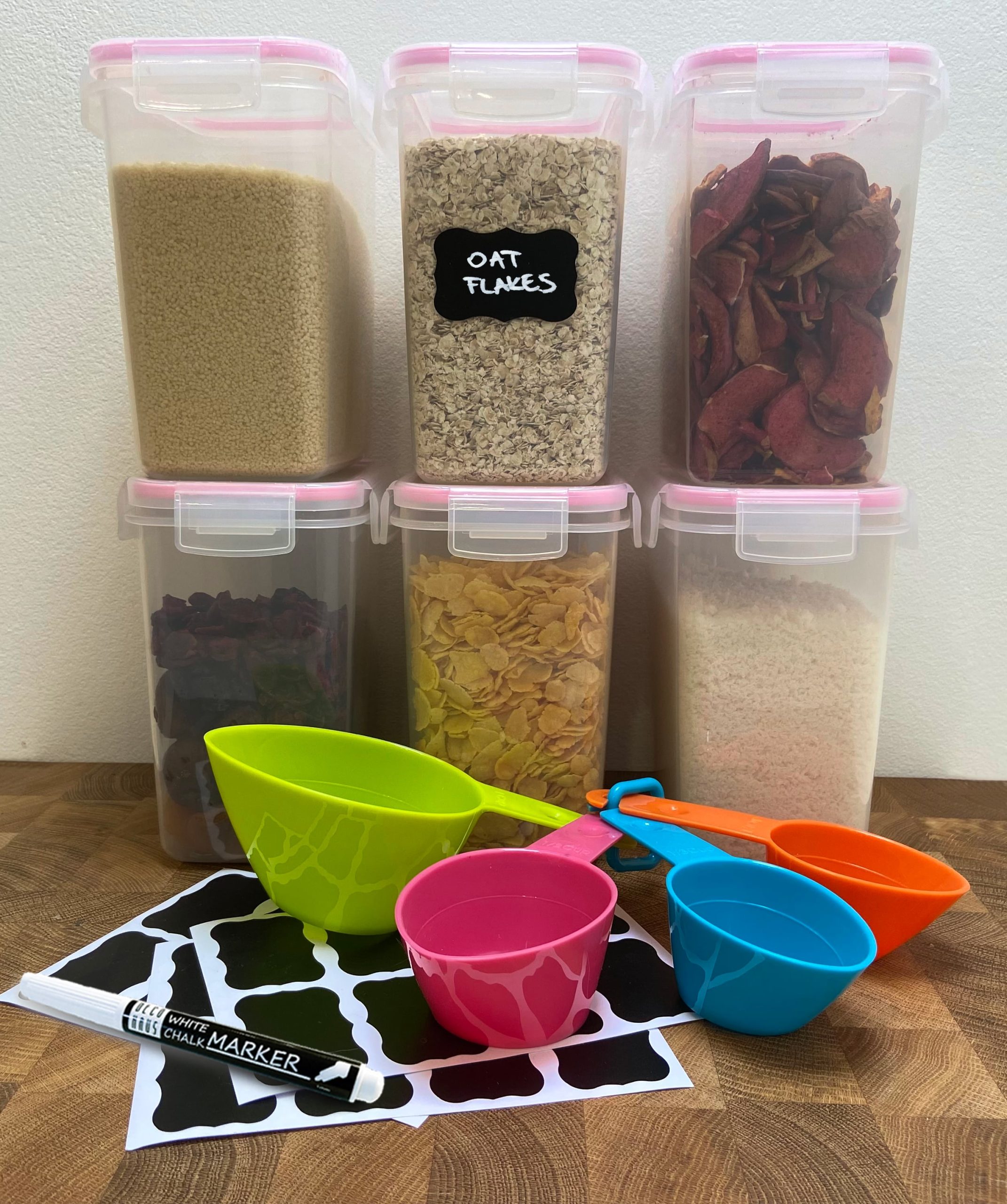 K nákupu přikládáme několik dalších položek, které se vám budou hodit a umožní ještě lepší organizaci. Každá sada je dodávána s opakovaně použitelnými štítky a vysoce kvalitním popisovačem pro snadné označování. Obdržíte také několik odměrných nádob, které vám pomohou při vaření.