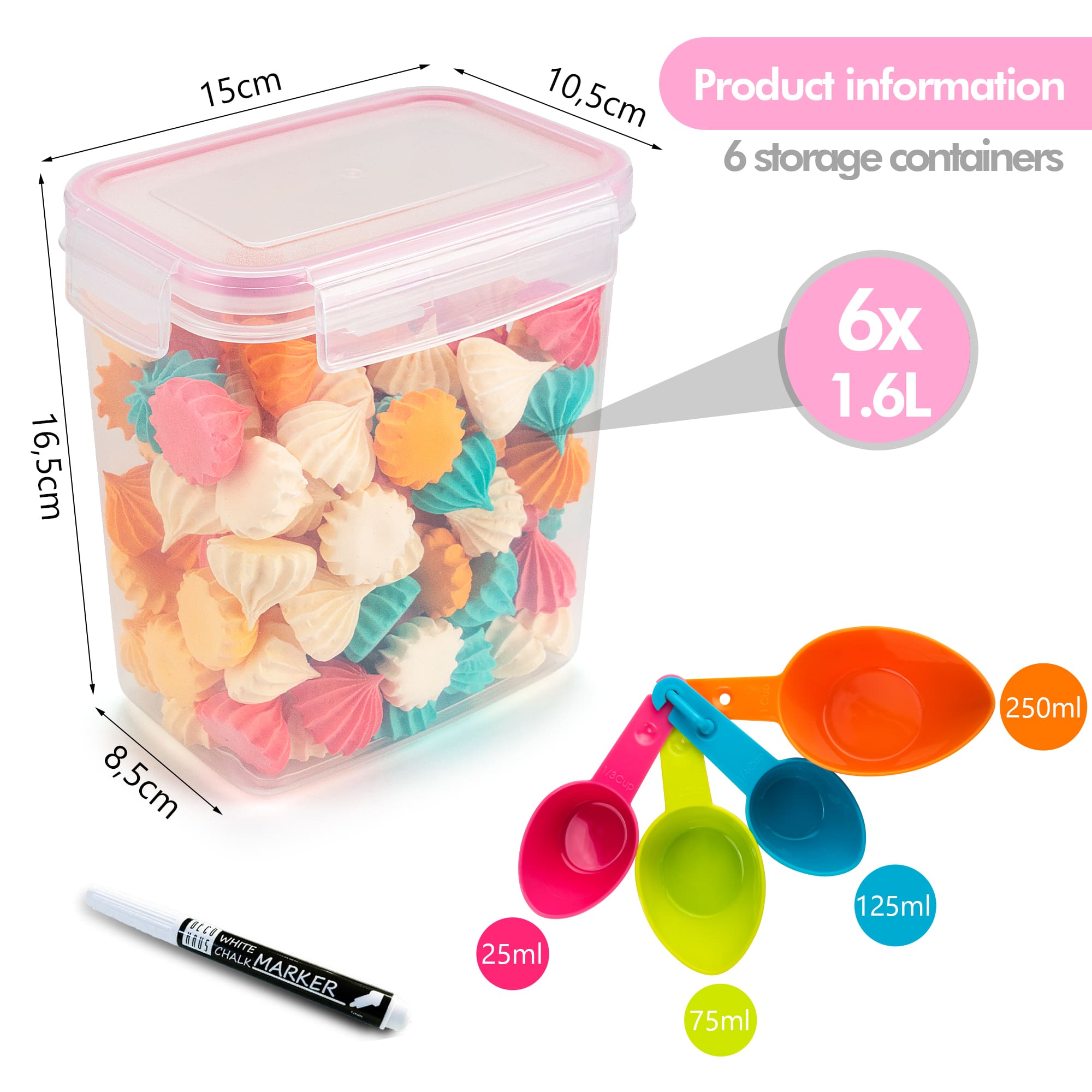 Tyto opakovaně použitelné nádoby na potraviny jsou 15cm dlouhé, 10,5cm široké a 16,5cm hluboké a nabízejí objem 1,6 litru – dost na vaše kuchyňské zásoby, ale zároveň tak akorát do skříně nebo spižírny. A protože každé balení obsahuje 6 nádob, máte nyní vše, co potřebujete, abyste si uspořádali svou kuchyň.