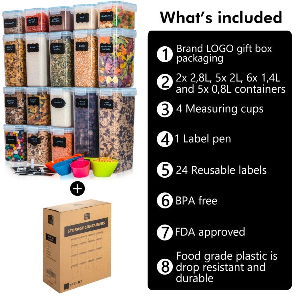 Naše 18dílná sada obsahuje řadu plastových nádob různých velikostí pro různé potřeby v kuchyni. V každém balení obdržíte 2 kusy naší 2,8litrové nádoby, 5 kusů 2litrové nádoby, 6 kusů 1,4litrové nádoby a dalších 5 kusů menších 0,8litrových nádob. Od této chvíle se vaše kuchyně uspořádá sama!