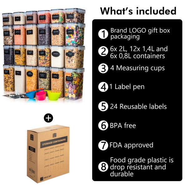 Naše 24dílná sada obsahuje řadu plastových nádob různých velikostí pro různé potřeby v kuchyni. V každém balení obdržíte 6 kusů naší 2litrové nádoby, 12 kusů 1,4litrové nádoby a dalších 6 kusů menších 0,8litrových nádob. Od této chvíle se vaše kuchyně uspořádá sama!