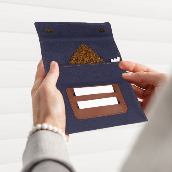 Tento sáček na tabák k ručnímu balení má další přihrádku na filtr, držák na dvojité cigaretové papírky a elegantní kapsu na tabák, do které můžete svůj tabák prakticky a stylově uložit.