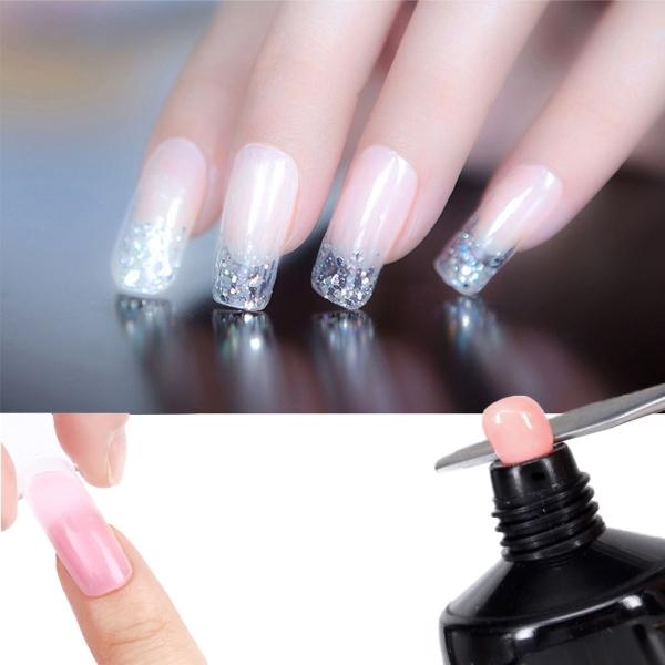 Pod umělý nehet nanes tenkou vrstvu poly gelu, který potom nalepíš na svůj nehet. Po sušení pod LED lampou umělý nehet jednoduše odlepíš.
